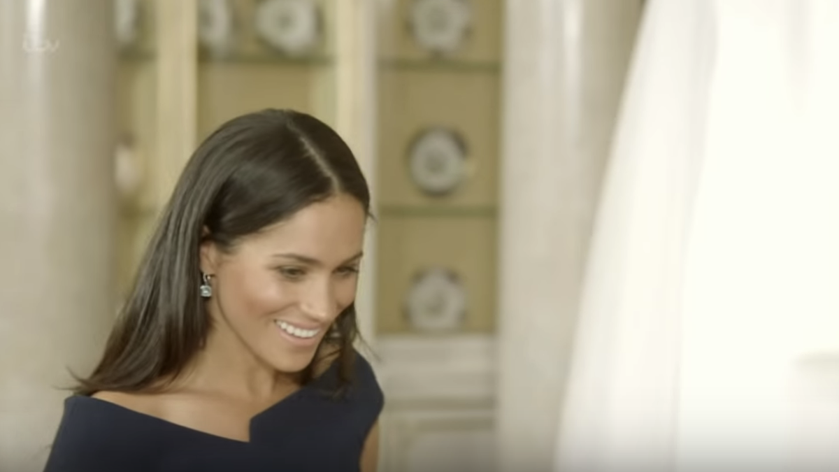 We don't see too much of Meghan in the 40 second preview, but the trailer does show Meghan's reaction to seeing her finished wedding dress for the first time. It's an intimate look at the Duchess of Sussex as she prepared for one of the biggest days of her life. Her face pretty much says it all.
